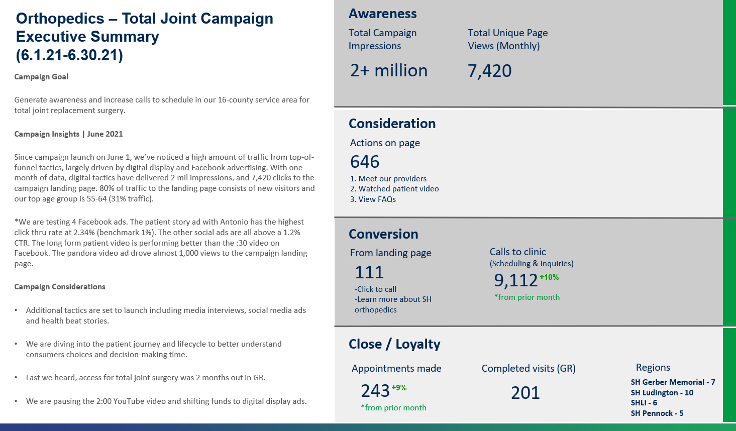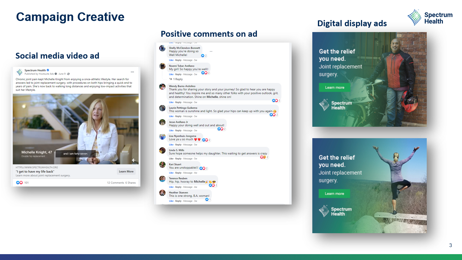 • Project lead on annual service line marketing campaigns. - Notable campaigns: Breast Cancer Awareness - increased website visits by 46%, calls by 21% and appointments by 5% - Urgent Care Campaign - increased patient volume by 20%. • Content manager of Helen DeVos Children's Hospital Facebook, Instagram and Twitter accounts - Increased Facebook posts by 71%, engagement by 12% and Instagram followers by 11% in 12 months. • Guided marketing campaigns from strategy to execution and report on weekly metrics to optimize campaigns. • Collaborated across departments to achieve success and elevate Spectrum Health's brand. • Analyzed campaign metrics and present monthly reports. • Developed strategic and creative posts for Spectrum Health's social media outlets. • Worked with agencies to develop creative concepts and purchase media.